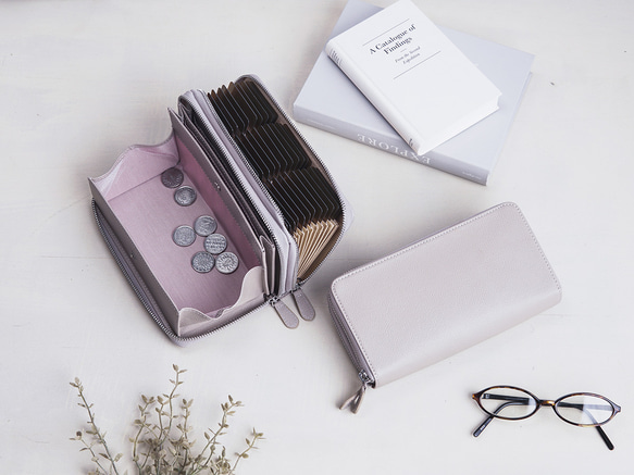 【micの長財布一覧はこちら】 長財布: ★仕様説明の画像について 中の仕様説明の画像には、オレンジを使用しております。 ★カラー選択について オプション設定の「種類」よりご選択ください。 ブラック/グレージュ/オレンジ/ネイビー 全4色 それぞれ小銭入れの中のお色が異なります。商品画像17枚目をご覧ください 【作品を動画でご紹介しています!】 お店のYoutubeチャンネルで作品をご紹介しています! 2分程度の短い動画です。是非ご覧ください! → 【おすすめポイント】 39枚もカードが収納でき、整理がしやすい大容量の長財布です。 ■カードポケットは39枚分! カードは縦に挿すジャバラ式で出し入れがスムーズ。 ラミネートされたカードも収納できます ■小銭入れは大きく開き、取りたい硬貨が見分けやすく探せます。 ■マチ付きのお札口が2つ付いています。 種類別に仕分けるのはもちろん、通帳・パスポート、スマートフォンも入れられます。 ■4つのフリーポケットもついているので、 レシートやチケットなど、お金とは別にしておきたい細かなものをしまい込むこともできます。 ☆革の産地 表 日本製牛革 /中 日本製 人絹 ・日本製 合成皮革 ☆革の固さ 初めは張りのある固めの手触り。馴染んでくると少しくったり。 ☆生地部分 レーヨン ☆カードポケット 39枚 ☆フリーポケット 5か所 ☆小銭入れ 〇 ☆お札仕切り 〇 ☆サイズ 横20cm×縦11cmx厚4cm ☆重さ 約300~320g※ ※重量は製品により個体差がございます。 ★ショルダーストラップを取り付けて、ショルダーポーチにできます! ご希望の方は、オプションよりご注文ください。 ※お取り付けには約2週間ほどお日にちを頂戴しております。 詳細は、下記ページをご覧ください。 ★革について 兵庫県たつの市で鞣し・加工された型押し加工を施したクロム鞣しの牛革を使用。 型押し加工をすることにより革表面が締まって、傷や汚れがつきにくくなります。 メンテナンスを含めて他の革より取扱いやすく、 初めて革製品を持つ、という方にも気軽にお使い頂けます。 ---------------------------------------- ★ギフトラッピング 無料で不織布ポーチへお包みいたします。 ラッピングご希望の方は、 ご注文カートに入れた後に「ラッピングあり」にチェックをお入れください。 #大容量財布 #長財布